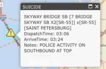 | 01.10.20, iontb/fb, Skyway Bridge: Expect delays southbound as multiple agencies on-scene after subject jumped from center span. Recovery ongoing. later: Confirmed death. | |||