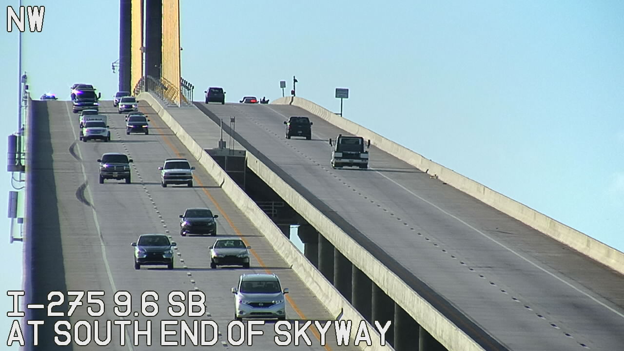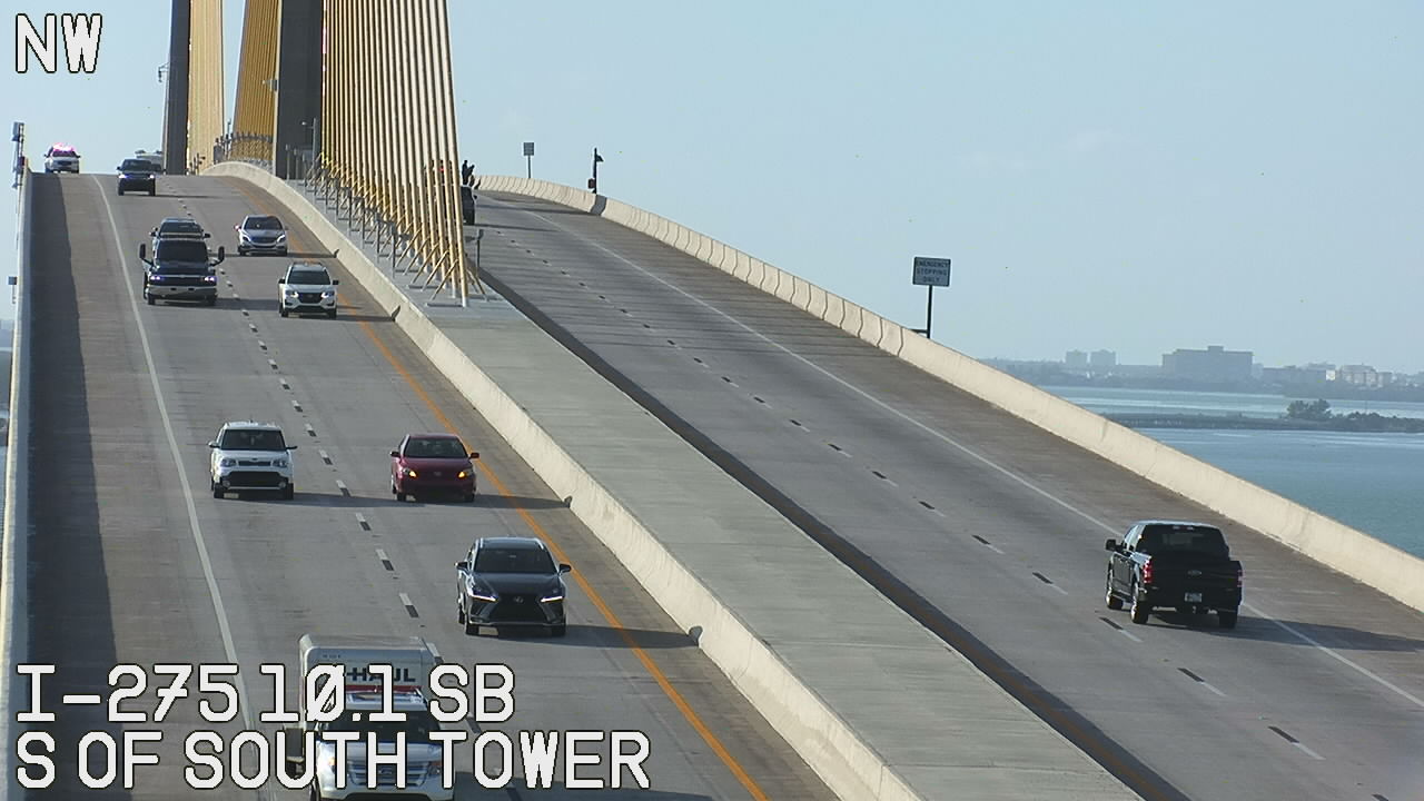 Beginning at about 10:30 a.m. Friday morning, northbound traffic on I-275, originating from atop the Sunshine Skyway Bridge, began to back up for miles. Florida traffic officials reported that "police activity" atop the bridge had closed the right hand lane and traffic was forced to merge into left-hand lane. A witness who declined to be named, described the scene as what appeared to be a single abandoned vehicle and at least three law enforcement vehicles were on scene. While traffic officials did not immediately update the situation by Friday afternoon, traffic cameras indicated that the right hand lane had opened and traffic was again flowing normally beginning at around 1:15 p.m. Traffic cameras originally showed motorists continuing to back up from atop the bridge well south into Manatee County and the witness said the traffic jam was miles long. There was no other information immediately available from authorities. |