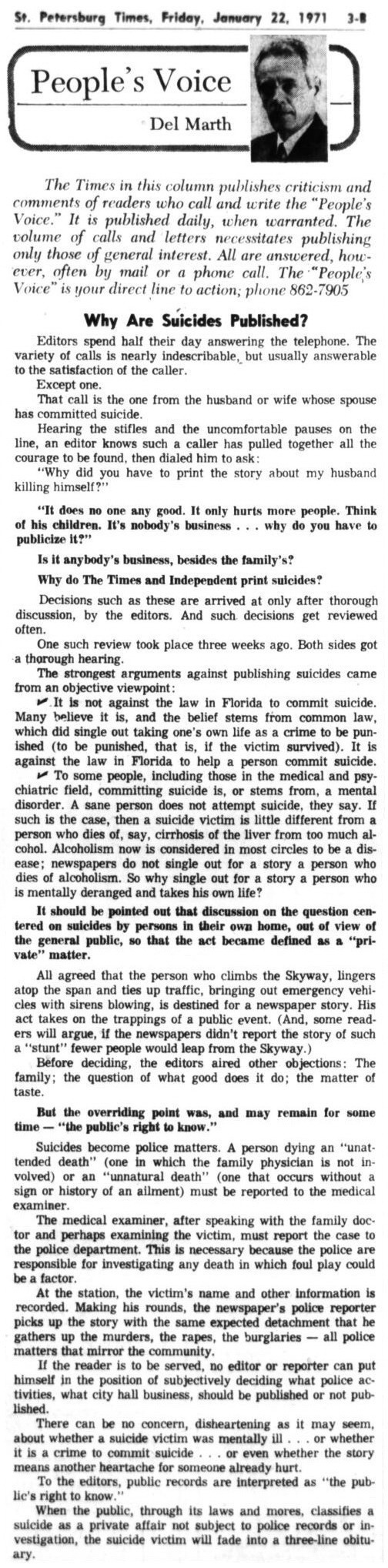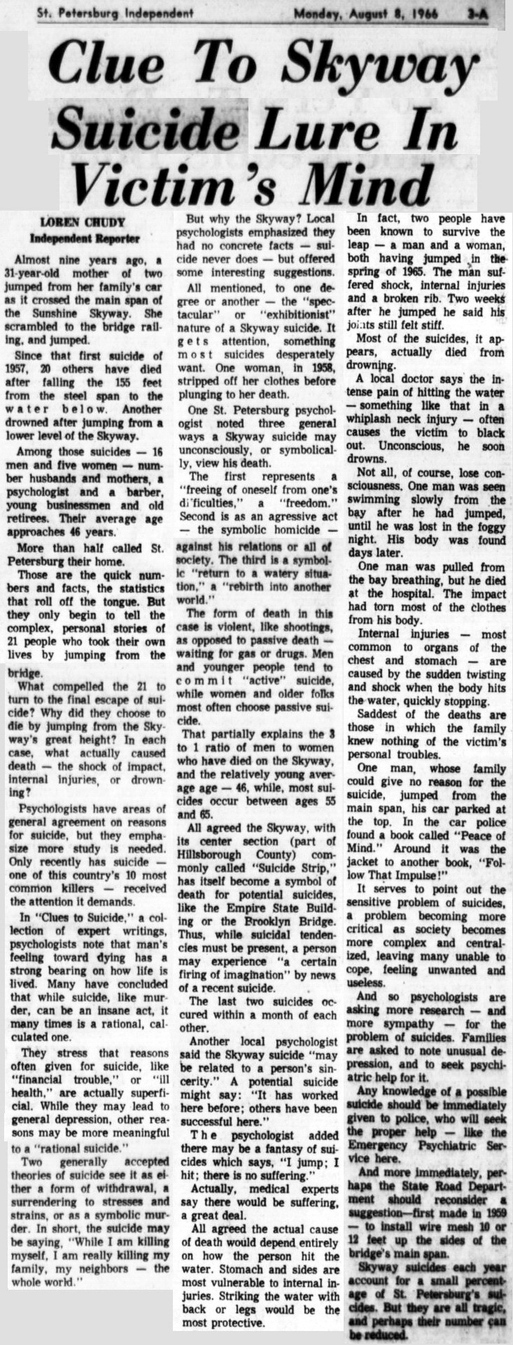 ![]() ![]() our feeling exactly: "makes a public event of his departure". jumping off the skyway is a public event. everyone gets to know. |