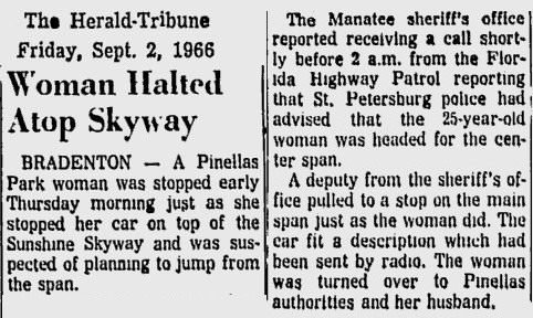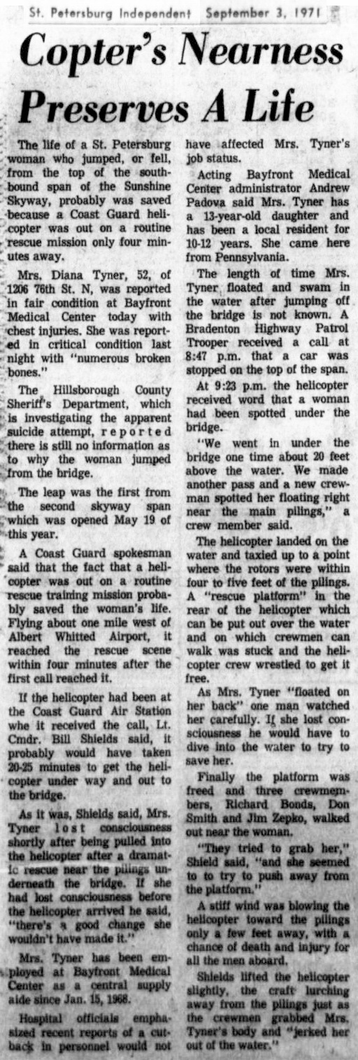 09.02.71: jumper, female, lived Diana Tyner, 52 first reported jumper from the second span. |