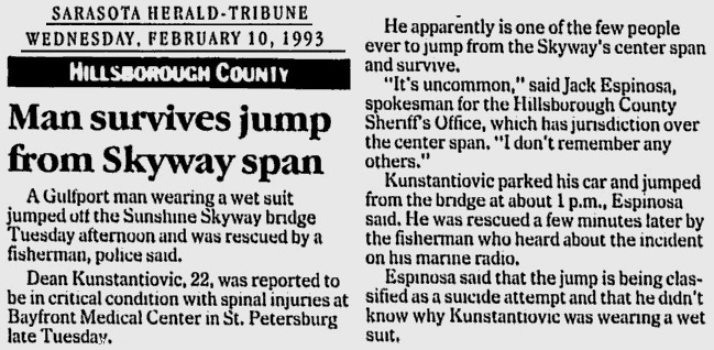 ![]() 02.10.93, st. petersburg times, Man plunges from top of Skyway - and lives, Dressed in only a wet suit, Dean Konstantinovic parked his car at the top of the Sunshine Skyway bridge, got out and jumped. Two minutes later, a fisherman found Konstantinovic floating in Tampa Bay. Judging from the bruises on his unclad feet, he hit the water feet-first, paramedics say. Konstantinovic, 22, of Gulfport was listed in critical but stable condition late Tuesday at Bayfront Medical Center. 05.22.09, tbo.com, ···Dean Konstantinovic leaped in 1993, leaving him paralyzed from the waist down. He died last year from pneumonia 15 years after the jump.··· |