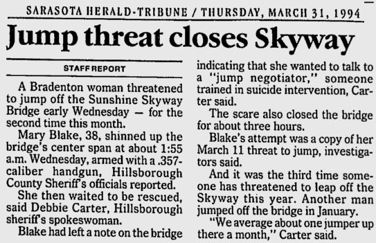 03.31.94, st. petersburg times, St. Petersburg; Suicide threat ties up Skyway, A woman with a .357-caliber Magnum stood on a railing of the Sunshine Skyway Bridge early Wednesday and threatened to jump into Tampa Bay, holding up traffic for more than two hours, said spokeswoman Debbie Carter for the Hillsborough County Sheriff's Office. Mary Blake, 38, of Bradenton, had threatened suicide on the bridge Wednesday and once in February, Carter said. More than six police agencies came to the scene Wednesday starting about 2 a.m., Carter said. Blake was talked out of jumping off the bridge about 4:20 a.m., Carter said. Blake threw the gun in the bay before being talked down and was later referred to counseling by the Sheriff's Office, Carter said.