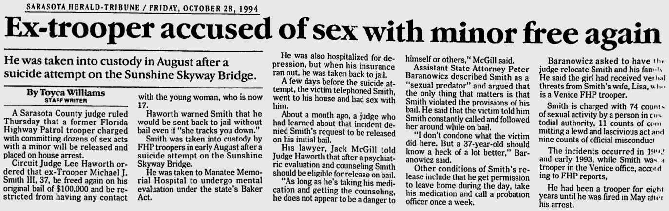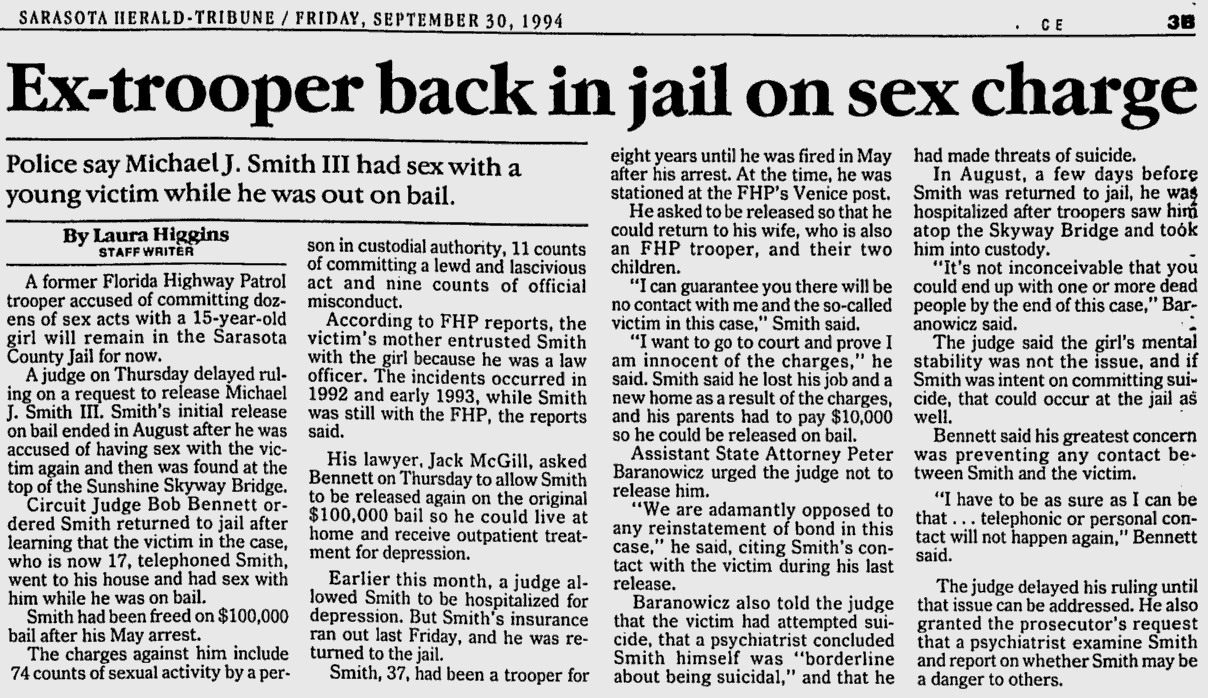 09.07.94, st. petersburg times, Skyway jumper survives plunge, A 32-year-old man survived a leap Tuesday from the Sunshine Skyway bridge, police said. Surveillance cameras atop the bridge saw the man as he jumped about 5:56 a.m. Tuesday. Bridge officials summoned the Coast Guard, which used boats and helicopters to rescue the man, who was taken to Bayfront Medical Center. "He was able to talk but he went into shock within seconds of being put on boat," Coast Guard Petty Officer Robert Melin said. Officials declined to identify the man. He plunged from a point about 100 feet above the water. 09.07.94: full article ![]() 08.24.18, Jake C., twitter, In 94 I was fishing under the main span in a boat. Out of the corner of my eye I saw (& heard) a huge splash. I looked 200 ft up thinking something must've fallen off a truck or sum1 threw something off the bridge. It was kinda rough with rolling seas. Then, I saw a head bobbing. We pulled up anchor and drove to him. I couldn't believe it. I said "did u just jump?", and he said "just leave me alone" Then he started passing out and went under. My buddy jumped in and pulled him into the boat. His entire side, from head to toe, was black from hitting the h2o He started vomiting a yellow, foamy bile. Another boat pulled up and a lady yelled "give him mouth to mouth!"... Right.... He finally died right in front of us after about 5-10 minutes. He was in excruciating pain, not just mentally, but physically from hitting the water. We called the coast guard, they put him in a bag, and even mopped our boat. There was a blurb in the paper the next day. He was a private investigator from Tampa. Sad |