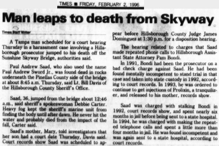 throwback jump story: 09.07.25, facebook post - 09.08.95, Joseph Harold Landfried, 41, was blinded as a child. he convinced a taxi driver to stop at the top of the skyway, because he really wanted a chance to "hear the water and feel the gulf breeze". he got out of the cab and soon after, "toppled" over the side. was it deliberate or a mishap? comment: 09.07.25, Debbie K., Deliberate. There are many places one can hear the water and feel the breeze. Simply open the car windows. top of this article more throwback stories |