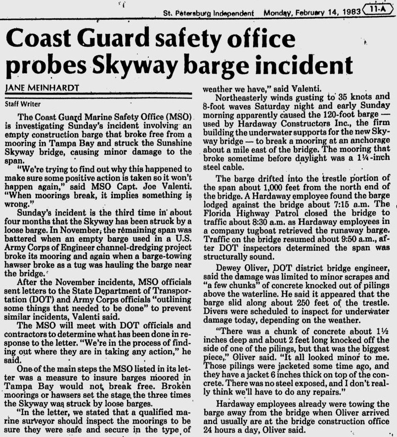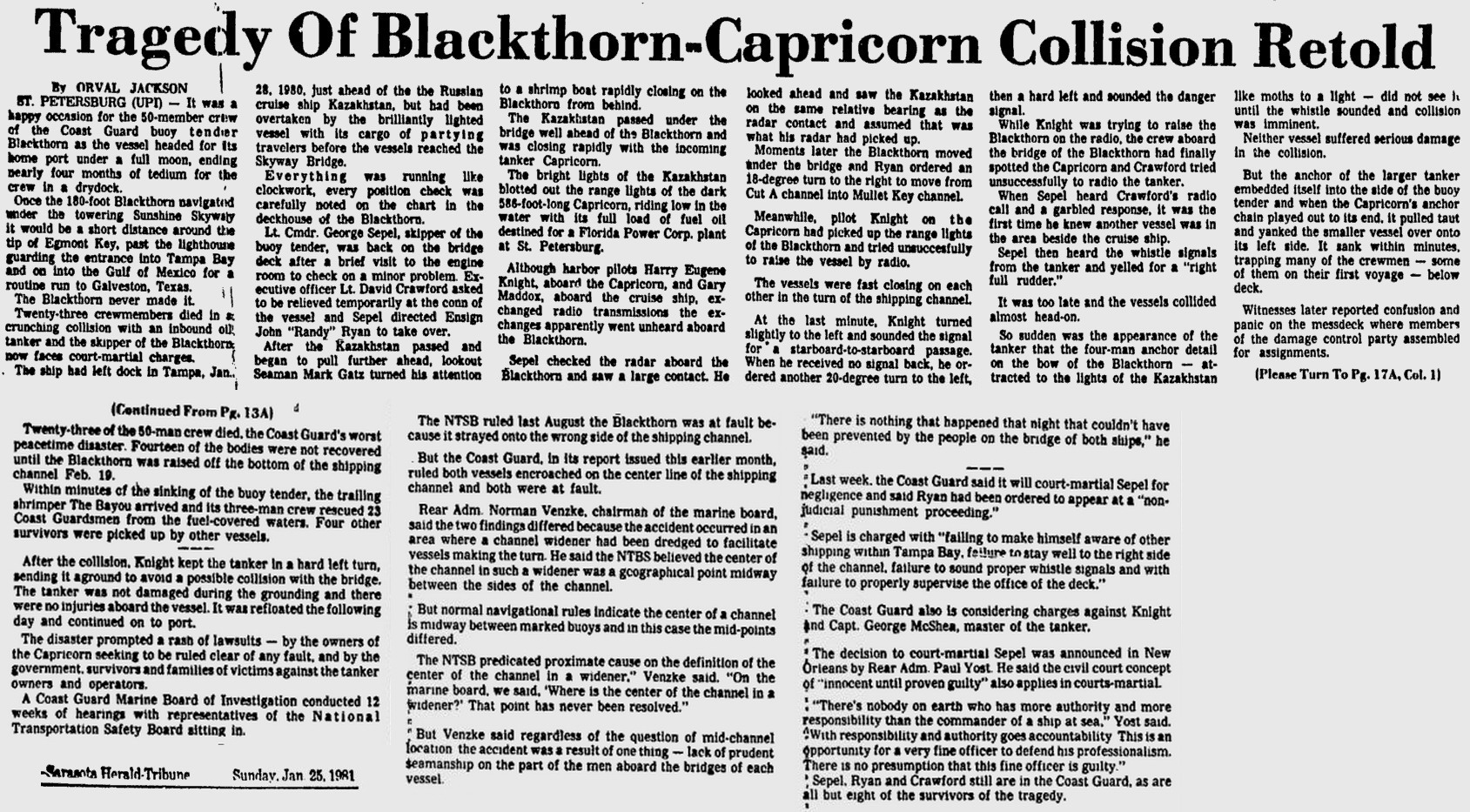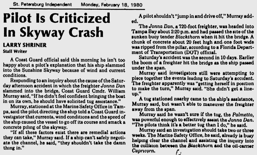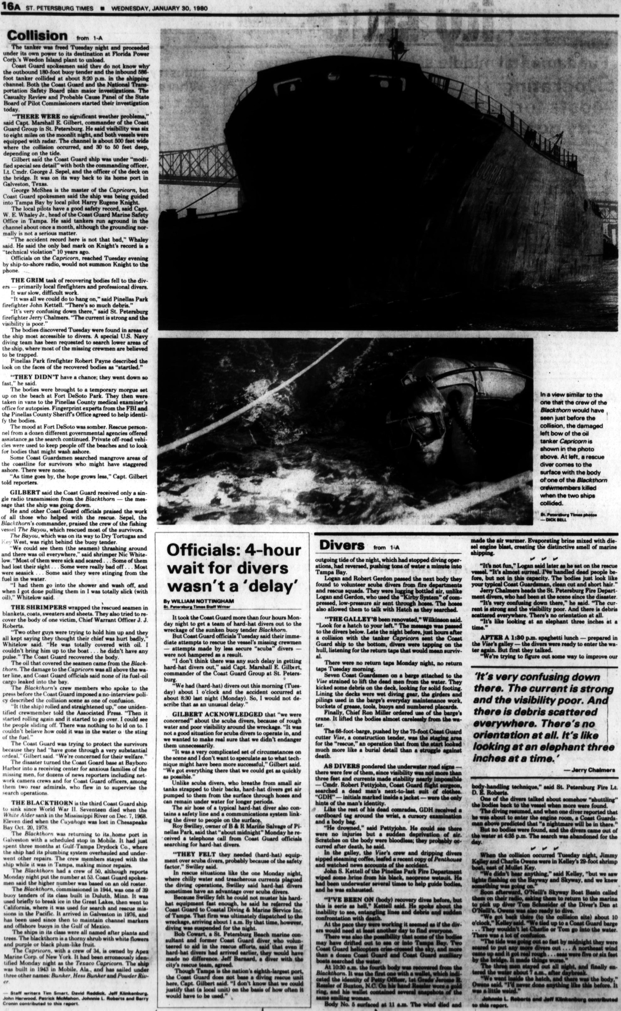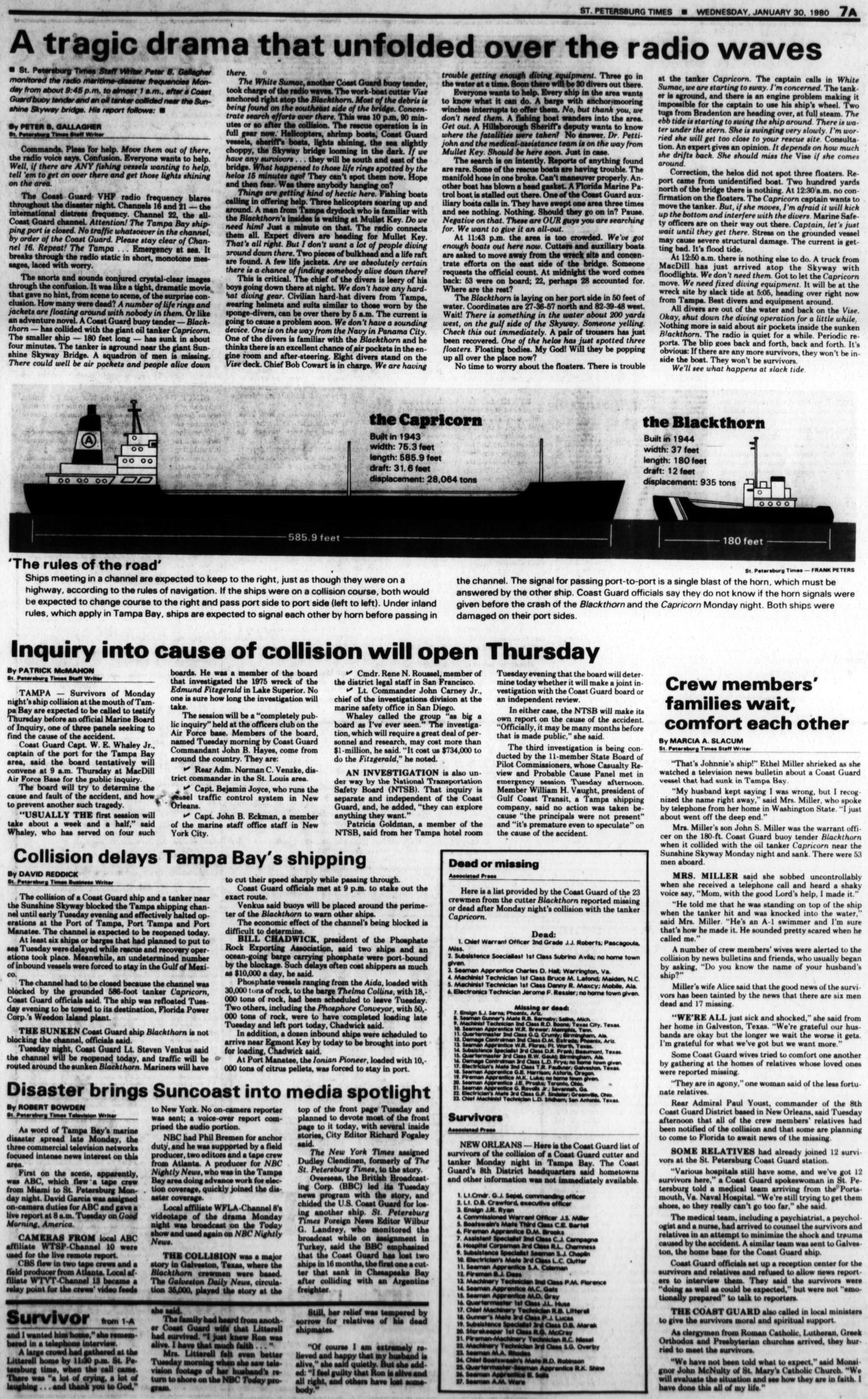 page 16![]() 01.30.80: full article ![]() 02.08.80: full article ![]() 02.20.80: full article ![]() 02.20.80: full article ![]() 02.21.80: full article ![]() 01.25.81: full article ![]() 01.28.15, wusf.usf.edu, Ceremony Remembers Those Lost in Coast Guard Disaster, It still stands as the U.S. Coast Guard's worst peacetime disaster. And 35 years later survivors, family members and supporters still gather near the Sunshine Skyway Bridge each year to remember the sinking of the Blackthorn. On Wednesday morning, a memorial service was held to remember the 23 crew members who lost their lives when the Blackthorn sank near the Sunshine Skyway Bridge. The ship sank when it collided with a tanker, the Capricorn. Members of the Clearwater Coast Guard Air Station performed an aerial flyover salute under bright blue skies and in a cool stiff January wind as the ship's bell rang one time for each of the lives lost. Master Chief Petty Officer Steven Cantrell read the names of those who died that night, to the sound of 23 sharp, clear strikes of a bell. Steve Coleman is now a high school science teacher in Georgia. But he was a 21-year-old seaman apprentice that night and he says rarely does a day go by when he doesn't think about that night. "All of the details of the night of January 28th are especially clear in my memory and I've shared the story with hundreds and hundreds of people," said Coleman. Following the reading of the names, numerous wreaths were placed at the site of the marker bearing the names of the victims. A Coast Guard helicopter hovered just off the coast, dropping a wreath into the Gulf waters and bagpipers played amazing grace. "I have a tendency to tear up and get choked up at this ceremony and today will be no exception," said Coleman. 01.28.22, extensive 64 page article about the accident. 7mb |