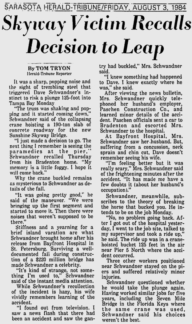 | 03.12.12, Daniel Smith, Red Boiling Springs, Tn., I fell off of the bridge on 2-28-88 at approx 3:30 am. while attending to the victims of a terrible crash. At the time I was a fireman for Venice, Fl. I fell near where the cables attach to the bridge on the north side. I thought I only fell about 70 ft but later found that it could have been around 150 ft. I have been the butt of many jokes because I am told it was a "leap year", but several lives were taken by that crash and I will always wonder if I could have done more to help them. Thanks, Dan Smith (retired Lt. Venice Fire Dept) (accidents can and do happen to those responding to accidents. you were indeed lucky to have survived the fall. try to not beat yourself up by thinking you could have done more. you responded, you tried. as for being "the butt of many jokes", consider that they were no doubt brought on by guys that liked you, because that's what guys do. thank you for sharing your story. we checked for a news article, but found nothing.) |