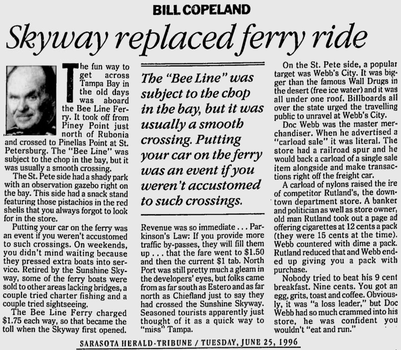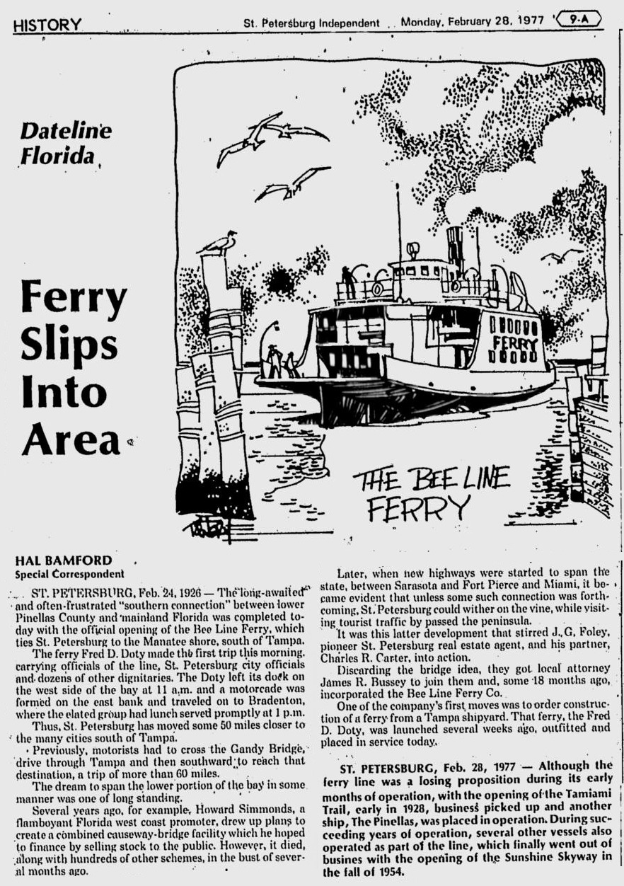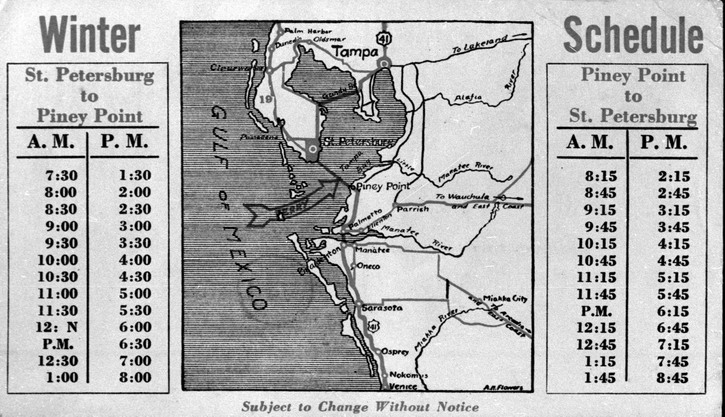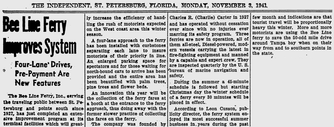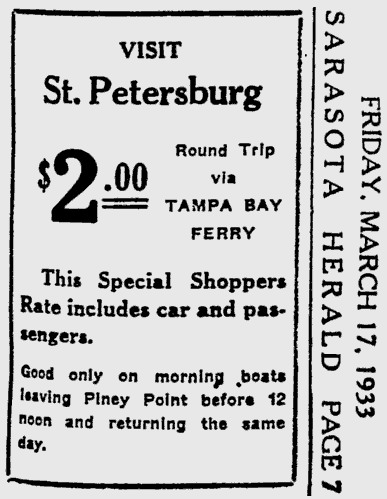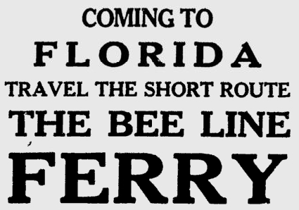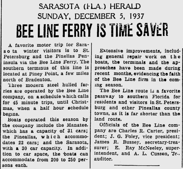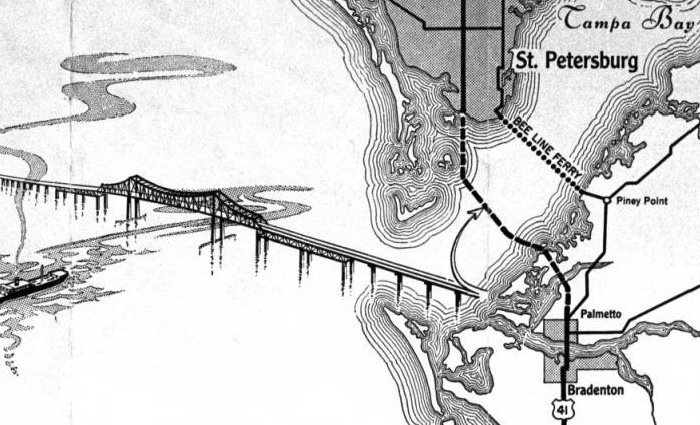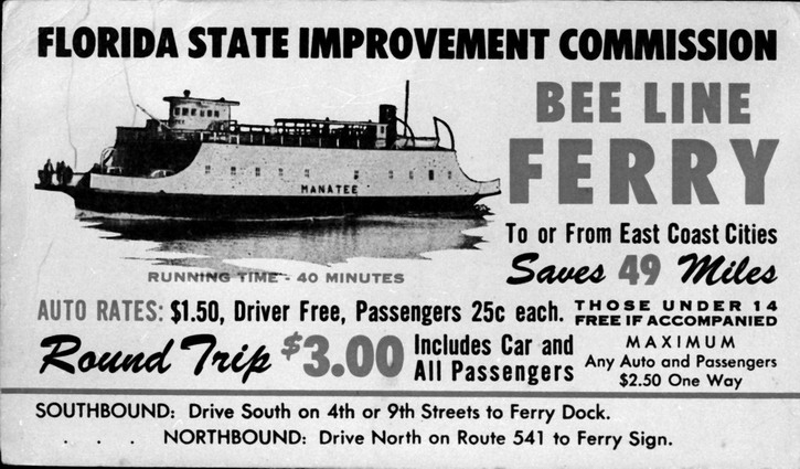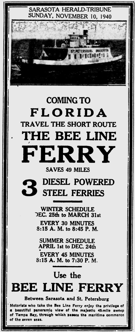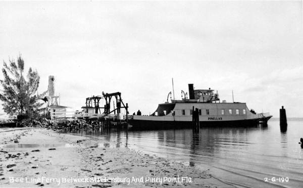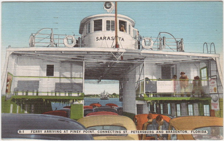 opened in 1954, the automobile trip between Bradenton and St. Petersburg was a 49 mile drive up State Road 41 through Tampa and then using the Gandy Bridge or the Courtney Campbell Causeway. Starting in 1926, the Bee Line Ferry offered travelers and residents a much quicker way to get to St. Petersburg from Piney Point in northern Manatee County. By taking your car and passengers by ferry, you could shorten the trip across Tampa Bay to only 22 miles and arrive in about 40 minutes to an hour. The cost was only $3.00 round trip for a car and passengers. The Captain of the Bee Line made $21.85 per day. Deckhands made $12.75 and had to work 12-hour shifts and 60-hour weeks. During the winter season, the Bee Line used four ferries and made eight round trips per day to handle the tourists coming to the area. The largest of the ferries could carry 36 cars, two others carried 25 each and the smallest one carried only 18 cars. At times the wait for the ferries could be as long as three to four hours. There was a concession stand at Piney Point that sold cold and hot drinks, candy bars, ice cream, sandwiches, cigars, cigarettes, and souvenirs. The stand was operated by a Jonnye and Alma Winters, a local family. Many members of the Winters family worked in some way with the Bee Line Ferry. There were celebrities that used the ferries, such as Joe DiMaggio, Yogi Berra, and Ted Williams as well as other ball players who were in spring training camps on the Gulf Coast. Special guests were given a tour of the wheelhouse of the ferry. The Ringling Circus used the ferries to transport their animals when they traveled to do their summer circuit around the country. The elephants proved to be fun passengers when they found sport in grabbing the life preservers from the overhead with their trunks and plop them down on the deck. The Bee Line became obsolete and went out of business when the Skyway Bridge opened linking Bradenton and St. Petersburg. crazedfanboy.com, The St. Petersburg terminal for this operation was located on 4th Street South, five miles south of the downtown post office, while the Piney Point terminal was located 11 miles north Bradenton on Road 541. The ferries ran from both terminals every 45 minutes, generally running between 7:30 A.M. and 9:00 P.M. The run time was 40 minutes one way and the distance was seven miles. The rates were: 1.. Automobiles: 10 cents per foot of car length, the driver was free, while passengers were 25 cents each. Children under 14 were free. Round trip was $3.00. 2.. Passengers without automobiles: 25 cents per trip. 3.. Trucks and busses: 10 cents per foot of vehicle length. 4.. Motorcycles and riders: 50 cents. 5.. Bicycles and riders: 25 cents. 6.. House trailers and commercial trailers: 10 cents per foot of trailer length. A book of tickets called a "Commutation Book" could be purchased for $7.50 for $10.00 worth of tickets. |