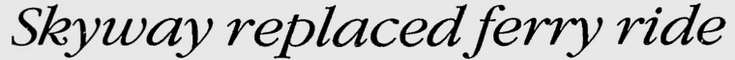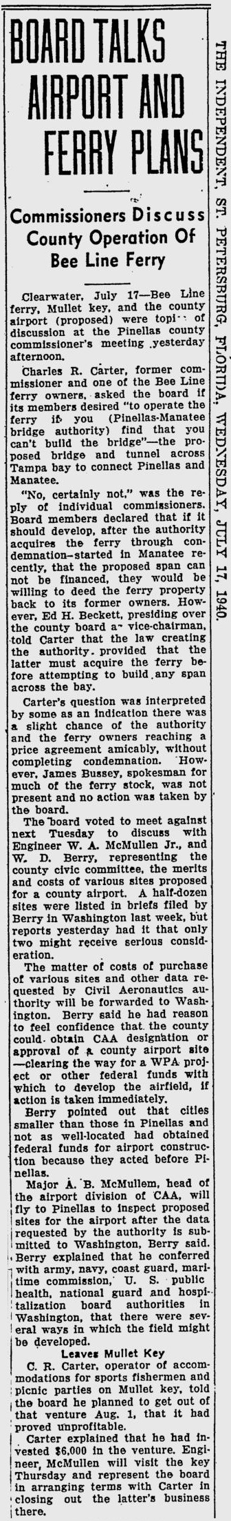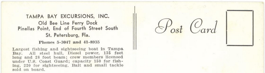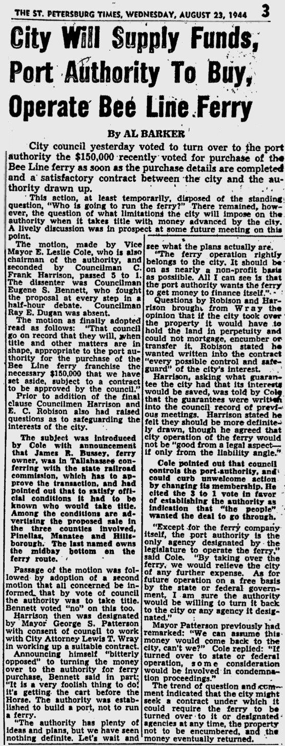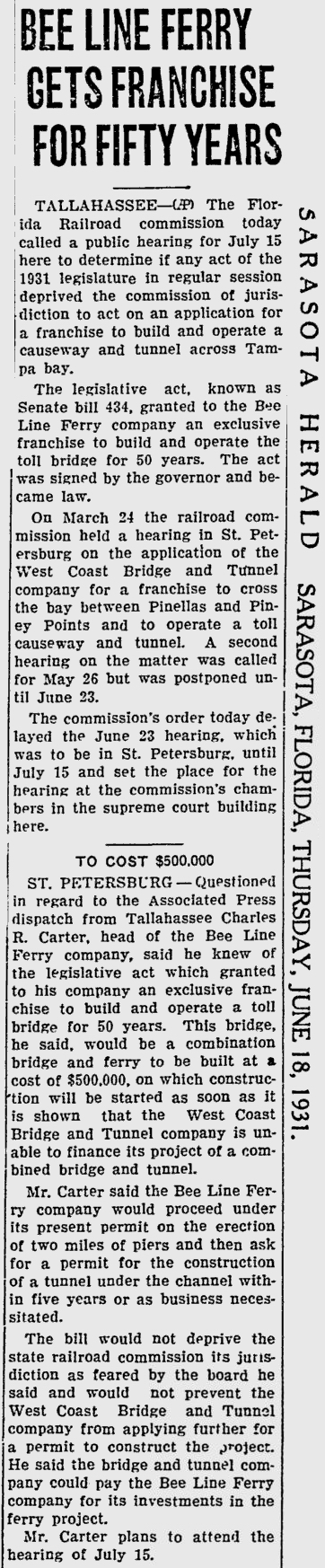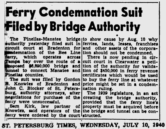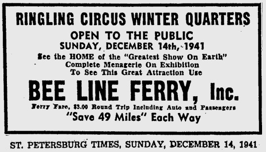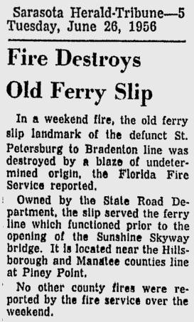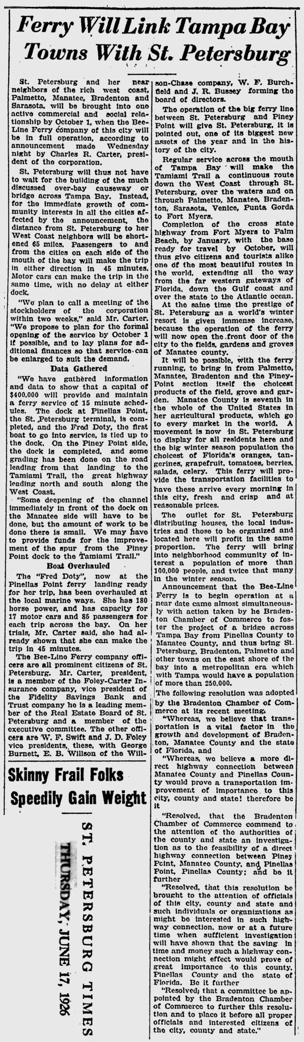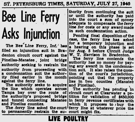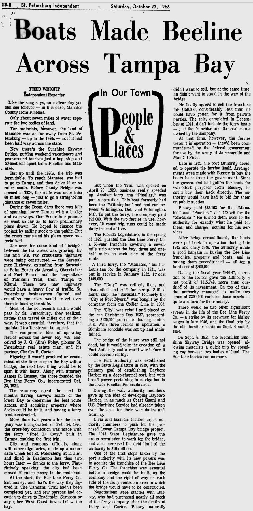 opened in 1954, the automobile trip between Bradenton and St. Petersburg was a 49 mile drive up State Road 41 through Tampa and then using the Gandy Bridge or the Courtney Campbell Causeway. Starting in 1926, the Bee Line Ferry offered travelers and residents a much quicker way to get to St. Petersburg from Piney Point in northern Manatee County. By taking your car and passengers by ferry, you could shorten the trip across Tampa Bay to only 22 miles and arrive in about 40 minutes to an hour. The cost was only $3.00 round trip for a car and passengers. The Captain of the Bee Line made $21.85 per day. Deckhands made $12.75 and had to work 12-hour shifts and 60-hour weeks. During the winter season, the Bee Line used four ferries and made eight round trips per day to handle the tourists coming to the area. The largest of the ferries could carry 36 cars, two others carried 25 each and the smallest one carried only 18 cars. At times the wait for the ferries could be as long as three to four hours. There was a concession stand at Piney Point that sold cold and hot drinks, candy bars, ice cream, sandwiches, cigars, cigarettes, and souvenirs. The stand was operated by a Jonnye and Alma Winters, a local family. Many members of the Winters family worked in some way with the Bee Line Ferry. There were celebrities that used the ferries, such as Joe DiMaggio, Yogi Berra, and Ted Williams as well as other ball players who were in spring training camps on the Gulf Coast. Special guests were given a tour of the wheelhouse of the ferry. The Ringling Circus used the ferries to transport their animals when they traveled to do their summer circuit around the country. The elephants proved to be fun passengers when they found sport in grabbing the life preservers from the overhead with their trunks and plop them down on the deck. The Bee Line became obsolete and went out of business when the Skyway Bridge opened linking Bradenton and St. Petersburg. crazedfanboy.com, The St. Petersburg terminal for this operation was located on 4th Street South, five miles south of the downtown post office, while the Piney Point terminal was located 11 miles north Bradenton on Road 541. The ferries ran from both terminals every 45 minutes, generally running between 7:30 A.M. and 9:00 P.M. The run time was 40 minutes one way and the distance was seven miles. The rates were: 1.. Automobiles: 10 cents per foot of car length, the driver was free, while passengers were 25 cents each. Children under 14 were free. Round trip was $3.00. 2.. Passengers without automobiles: 25 cents per trip. 3.. Trucks and busses: 10 cents per foot of vehicle length. 4.. Motorcycles and riders: 50 cents. 5.. Bicycles and riders: 25 cents. 6.. House trailers and commercial trailers: 10 cents per foot of trailer length. A book of tickets called a "Commutation Book" could be purchased for $7.50 for $10.00 worth of tickets. |