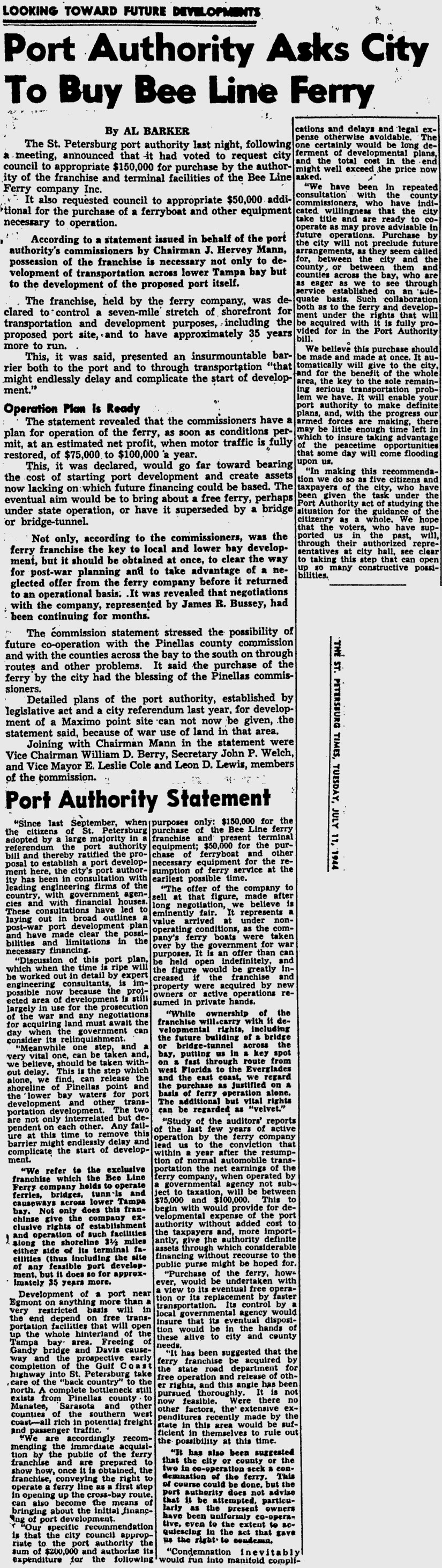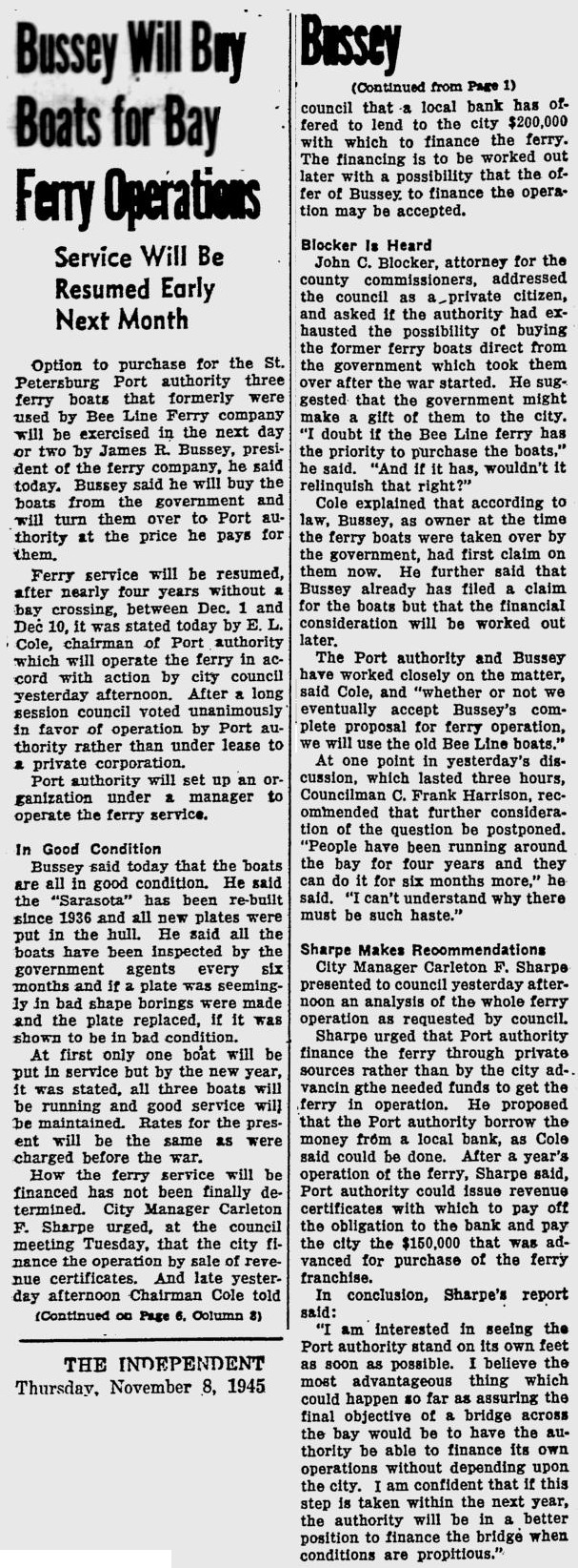 08.12.16, tampabay.com, Ferry plan calls to mind Tampa Bay's steamship past, When one thinks of traveling between Tampa and St. Petersburg, images of bridges and traffic immediately come to mind. But prior to the opening of the Gandy Bridge in 1924, steamships were by far the most popular and convenient way to move people and cargo to and from the coastal cities. The recent news of the proposed ferry service connecting the downtowns of Tampa and St. Petersburg brings to mind the long history of water-borne transportation across Tampa Bay. Steamship service across those waters began in the 1880s, but the most popular steamship line operated in the 1910s. The aptly named Favorite Line began operations April 1, 1909, after taking over the Independent Line. The new line operated three steamers, the Manatee, the H.B. Plant and the Vandalia. The Manatee had been in operation on Tampa Bay since the early 1890s, and it connected Tampa to the Manatee County port towns Palmetto, Bradentown (Bradenton), Manatee and Ellenton. The H.B. Plant covered the same ports, and both ships docked once a day in St. Petersburg. The Vandalia traveled exclusively between Tampa and St. Petersburg, with all three using the St. Petersburg Transportation Co. dock and pier downtown. That company operated the city's streetcar service, and a streetcar ran the length of the pier to connect the steamers with the city's transportation network. Over the next decade, the Favorite Line added two steamships – the Pokanoket and the Favorite – to replace the H.B. Plant and the Vandalia. The Favorite became the line's flagship, and it was soon synonymous with cross-bay travel. The three vessels continued to provide passenger and freight transportation to St. Petersburg and the towns of Manatee through the 1910s until 1919, when expensive repairs and debt began to weigh the company down. The Tampa Bay area had changed considerably during the 1910s. The growing use of automobiles coupled with government spending on road improvement (which grew dramatically following the conclusion of World War I) began to erode the local ferry services. The Favorite Line ceased operations on April 13, 1919 — almost exactly 10 years after it began service. An editorial from the Jacksonville Times-Union lamented the loss of the ferry line, saying it was interesting "how names go wrong and tastes change to the disadvantage of business enterprises. The Favorite Line of steamers, which once plied between well-known south Florida resorts, has been put out of commission by the automobile road." Several months of discussions, meetings and interventions by business leaders in Tampa, St. Petersburg and Manatee produced many headlines but made little headway. A news story on one of the early meetings provided an ominous but (at the time) overlooked coincidence. The Tampa Board of Trade heard two committee reports at its July 21, 1919, meeting: the feasibility of restarting the Favorite Line and a report on the status of the "Gandy Bridge project". A buyer eventually came forward to acquire the Favorite Line. The Wilson Line, based in Philadelphia, purchased the line in late 1919 and began operating the Favorite along with a ship from its northern line. Service resumed in December 1919 and included all of the ports of call of the old Favorite Line. In 1921, the Wilson Line discontinued service to Manatee County. The Adams Boat Line from Sarasota took up that service and included a stop in St. Petersburg. The Wilson Line continued its service to St. Petersburg, and both lines operated as much for the tourist trade as it did for regular passenger and freight traffic. The opening of the Gandy Bridge on Nov. 20, 1924, signaled the beginning of the end for bay area ferry service. By 1927, neither the Wilson Line nor the Adams Boat Line were operating between Tampa and St. Petersburg. The last bay area ferry service, the Bee Line, connected Point Pinellas in Pinellas County and Piney Point in Manatee County until the opening of the Sunshine Skyway bridge in 1954. As with many events in history, what was once old is new again. Automobile traffic, which prompted the demise of the cross-bay ferry system, has become so congested that ferry service may again become practical. Connecting that ferry to a larger transportation network, as the original ferry system was connected to streetcar systems in Tampa and St. Petersburg, may be more difficult to replicate. The Tampa Bay ferries were once an integral part of the area's transportation network. Only time will tell if the new ferry service will prove as beneficial. (it wasn't.) |