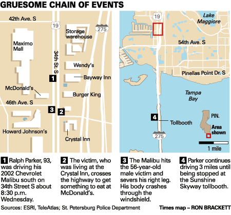 better way to decide who is fit to drive? ST. PETERSBURG - Ralph Parker had shown signs of dementia before, but his condition worsened dramatically over the past week. Argumentative one minute, calm the next. Alarmed, Parker's son left Idaho on Wednesday to get his 93-year-old father in a safe place, police said. Before he could get here, his dad backed his gold Chevrolet Malibu out of the driveway and went for a drive. It ended horribly. Parker hit a man crossing 34th Street S, severing the man's right leg, then drove 3 miles with the body stuck in the windshield. When police asked Parker what happened, he said the body seemed to drop from the sky. Parker thought it was December and that he was headed home to Pinellas Park, not south toward the Sunshine Skyway bridge, police said. The case is an extreme example of a complicated and enduring issue in Florida and everywhere: When is someone too old to drive? Experts say there is no reliable test or quick answer. Unless something changes, they say, the problem will only get worse. Julia Zumpf was driving south on 34th Street about 8:30 p.m. Wednesday when she saw the gold Malibu unsteady in the road. Drunken driver, she thought. Then Zumpf, 44, saw a pedestrian step off the center median and head across the three-lane road. "He didn't even walk straight across, he walked at a 45-degree angle toward the cars," Zumpf. "It reminded me of some cocky kid who walks in front of you." The driver of the Malibu slammed on his brakes, Zumpf said. She thought the driver missed him but suddenly she heard a crash and saw a leg flying in front of her blue Buick LeSabre. "It went at least one story in the air," she said. His shoe then popped off before the limb came to a rest on a strip of grass west of the street, in front of Howard Johnson's. The driver kept going, as if not realizing what happened, Zumpf said. She drove several blocks, trying to locate the body, thinking it rolled off the car, and called 911. "I thought it was just a hit-and-run," she said. The body was still on the Malibu. The head and shoulders were punched through the windshield, the torso slung backward over the hood. Three miles later, the car approached the Sunshine Skyway toll bridge. As Parker decelerated, the body slumped entirely inside, the man's face pushed up against the dash. The macabre scene looked like a Halloween prank to the toll taker. Then she saw the blood. Police had not released the name of the victim as of late Thursday. He was 52 and lived at the Crystal Inn across the street from the scene of the accident. The man, often seen begging for money on 54th Avenue S, was going to McDonald's for something to eat, police said. Residents at the hotel said his first name was Rudy. They said he was a hard drinker, but a decent man with long ties to St. Petersburg. * * * The fractured windshield obscuring his view, and blood streaming down the console, Parker told police he did not realize what happened until he reached the tollbooth. Even then, he thought a body dropped from above, perhaps a pedestrian overpass, said St. Petersburg police Officer Michael Jockers. "He may have somewhere in his mind have realized it was a crash, but immediately forgot about it," Jockers said. Bruce Bartlett, chief assistant in the Pinellas-Pasco State Attorney's Office, said it was unlikely the state would file charges. No final decision will be made until the police investigation is completed. To charge Parker with leaving the scene of a crash, prosecutors would have to prove he knew or should have known there was an accident. Additionally, he would have to be mentally competent to stand trial. Parker did not appear to know what happened, where he was or why he was there when he spoke with police officers, Bartlett said. Jockers took Parker's driver's license. Short of having the state take it away forever, Parker will have to take a test to show he is still competent behind the wheel. Parker hasn't been cited for any serious driving incidents during the past seven years, according to state records. His history is clean except for an expired tag. He last renewed his license in 2003, at the age of 91. It was set to expire in 2010. A spokesman for the state Department of Highway Safety and Motor Vehicles said the agency would conduct its own inquiry into whether Parker should have had a license. "We will investigate this vigorously to see how this could have been prevented, if at all," said spokesman Frank Penela. * * * In recent years, experts have sounded warnings about the risks of elderly drivers and the need for more comprehensive screenings. A state report released last year said Florida was facing a "critical situation with its aging population: the mature at-risk driver." The issue has gotten more attention because older drivers are living longer, buoyed by better medical treatment. Last year, nearly 270,000 people age 85 or older were licensed to drive in Florida. Of those, at least 20 percent are considered "dementia drivers," with a mild to moderate condition, according to a 2004 state report. Yet Florida, like many states, has no comprehensive system for evaluating whether older residents should be on the road. The only age-related requirement is that seniors age 80 or older must pass a vision test when renewing their license, generally every six years. That went into effect Jan. 1, 2004, two months after Parker last renewed his license. But vision tests do not reveal other factors that affect driving, such as Alzheimer's disease, side effects from medication and chronic health problems. While Florida and other states say they would welcome more comprehensive screening, no reliable test exists. "There's no foolproof way to predict someone's ability to drive safely," said Dennis McCarthy, co-director for the National Older Driver Research and Training Center at the University of Florida. "Many seniors can and do drive well," said Susan Samson of the Area Agency on Aging of Pasco