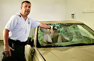 03.16.13, stpete.patch.com, An off duty St. Petersburg Police officer driving home around 4:30 a.m. Saturday was shot at in a drive-by shooting on the Skyway Bridge by the south side fishing pier ramp. The Manatee County Sheriff's Office said the officer, whose name is not being released at this time, was still in uniform and wearing a windbreaker with "Police" clearly noticeable on his sleeves at the time of the shooting. According to the sheriff's office report, the officer said an older model blue Honda pulled up beside him and fired a single shot. The officer reported only hearing one shot followed by his driver side window being shattered. The officer, according to authorities, was able to radio dispatch. Responding units searched the area, but the suspect's vehicle was not located. The officer was treated by EMS, and he sustained minor cuts to his face due to the shattering of the glass. The investigation is ongoing at the time. |