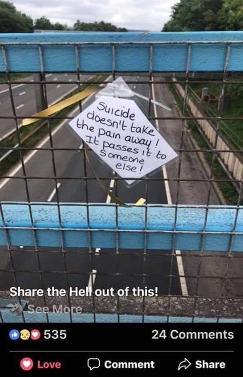 save a life project: leaving notes and signs to those in crisis. 09.30.20, somerset-kentucky.com, Suicide prevention signs posted on bridges in Burnside. 03.12.19, thenewstribune.com, messages for people considering jumping off bridge. 08.01.18, vnews.com, upper valley women post signs at Quechee Gorge. 06.23.18, mirror.co.uk, woman leaves notes, after she considered taking her own life. |