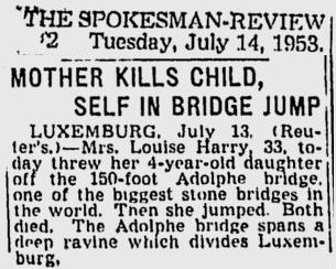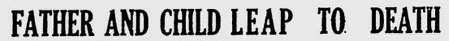 01.04.21, fox17.com, woman and child jump off an overpass, both dead. 06.15.20, fox5sandiego.com, father drives pickup off cliff with 2 daughters, video. 01.02.20, bradenton.com, mom jumps with son, another baby found dead in tub. 12.26.19, mirror.co.uk, mother 'threw' kids off building, then herself, on christmas. 09.13.19, thesun.co.uk, dad throws baby into a river. 05.21.19, dailymail.co.uk, mother and daughter tragic murder suicide. 02.25.19, nypost.com, mom throws kid from high-rise, then jumps to her death. 02.07.19, thesun.co.uk, dailymail.co.uk, Mum leaps 330ft to her death with son. 01.26.19, mirror.co.uk, mother jumps off bridge with daughter in arms. 08.02.18, abcactionnews.com, tampa mother throws her 4 year old daughter in a river. 08.02.18, iontb/fb • iontb.com, mother charged with murder. 08.03.18, hcso.tampa.fl.us, press release. florida.arrests.org: Shakayla Denson 06.14.18, thehansindia.com, mother throws six-month-old boy from bridge to death. 05.18.18, dailymail.co.uk, former playboy centerfold and son jump from penthouse. 05.17.18, indiatimes.com, woman, 3 kids jump from bridge into canal; mom rescued. 07.06.16, patch.com, mother of 7-month old intends to sue state. 02.22.17, wwlp.com, connecticut man found guilty after throwing son off bridge. 05.31.17, usnews.com, man who threw baby off bridge gets 70 years in prison. 10.25.16, foxnews.com, man dead, 2 children survive jump off new jersey bridge. 08.04.85, sandiegouniontribune.com, 32 years after surviving her mom's fatal jump. 08.04.78, 07.14.53, 07.24.45, |