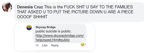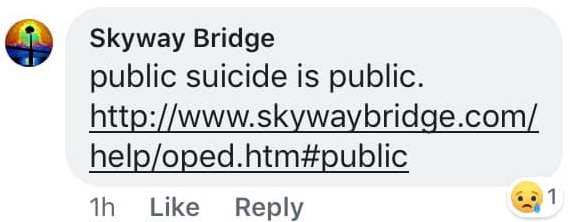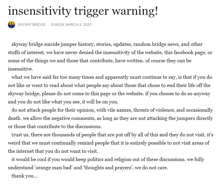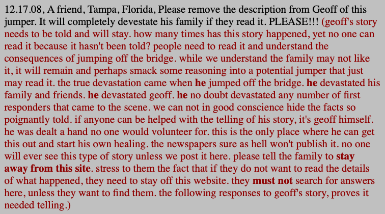 03.17.21, iontb/fb, • Daniel F., There is a Web site and they posted pictures of my brother and his car Sad situation for people doing that.But maybe a wake up call for people to think twice beforehand. (glad to see you may be viewing the situation as perhaps something that can help prevent future suicide events.) • Heather C., Daniel F. I remember this and the page that posted photos " Skyway bridge " something. I commented they need to remove photos . The person ( use the term loosely ) that runs the page made jokes and got really foul with me. That idiot comments on this page too. They have no morals. (dear heather, please share proof of your "made jokes and got really foul with me" accusation. we promise to post 100% of everything you show us. since this idiot knows we did not, this idiot knows you can not. [update as of today: still nothing from heather, as expected.]) • Daniel F., You are absolutely right with that ass wipe. He has no sole what so ever. As they say nowadays a bully behind his computer. (dear daniel, so now it's not something that can help prevent future suicide events? as you may recall, you became completely unglued, intolerable, name called, and wished harm to people that commented on your foul behavior, here and here and on mydeathspace.com and our facebook forum. you posted "Donna J. Hipe your whole family drives off the bridge bitch and suffers a slow death". yeah, that was all you. you also sent private direct messages to others with vitriol and hate. we get it, you were angry about your brother, but perhaps reassess just who the bully may be. fyi, it's "He has no soul what so ever.", as we do have shoes.) • Suz H., Who took pictures where, when? • Heather C., it's a Face book page " the skyway bridge" something ? I left it when they did this the person running it makes jokes posts pictures . Real POS they comment on here too (these jokes?) • Daniel F., Yeah one of his sick humer was when he said ( snap like a pretzel ) meaning what it was like hitting the ground .He will get his in his lifetime ( Karma) (you already know we did not say that, yet you continuously say we did. the word 'pretzel' was never used and you will have zero success at proving us wrong. you are quoting someone not us, that posted "snap, crackle, pop" on our facebook post and we deleted it then. please continue misquoting us, as it makes more filler for these hate pages.) 09.09.20, Bre W., My name is Bre, and I came across your website and I just wanted to discuss the purpose of it and the effect it has on certain individuals. I understand this site was formed to help people, and that was an amazing step you took, and I would like to discuss some things with you regarding it's subject material. Kindest regards, Bre W. 09.09.20, hello bre, sure, ask away. 09.09.20, How do you view the jumpers? What's your opinion on them as a person? 09.09.20, i see them as troubled souls, unable to cope with what life has dealt them. be it social, love, criminal, or health issues, they have chosen to take a public exit in front of the world. i find it a sad choice and hope they have found the peace they desired. 09.09.20, I agree, and I think it's heartbreaking. The site sends a different message, however, and seems to shame the jumpers. I just feel that it makes them seem worse and actually could drive them to do it but maybe in a different way. How do you feel would be the best way to talk a jumper out of jumping? What would you say or tell them? 09.09.20, we would like to see some evidence of shaming. "seems " isn't enough to convince us. no one contemplates suicide based on the website. there must be underlying circumstances that drive their desire to self end. their method is their choice, as well as their right. as has happened, when given the opportunity to chat with a potential suicidal, we attempt to get to the root of their issue and go from there. each reason requires a different approach. we attempt to get them to try and understand another way to approach their choice and the reasons for it. 09.09.20, On your site's home page you've titled it "irreverent" since 1998-Even if you were mocking the site's haters this seems as if you just don't care. ![]() This part of this seems highly insensitive ![]() This shows someone asking to get a story taken down for the sake of the family-and you refused ![]() Have you heard of the site Best Gore? 09.09.20, if you followed the "irreverent" link, which is not a title, you would see we are not mocking the jumpers, but the article writer's declaration of the site's irreverence. as for the article written by the man that actually dealt with a badly damaged jumper, it is his story about his experience in trying to rescue a jumper. it was something that actually happened to him and he wanted to tell his story. who is to tell him he can not? we think you might need to understand one thing, jumpers add themselves to the website. it's not like we find people and toss them off the bridge, in order to post about it. they voluntarily cast themselves into the afterlife publicly. in doing so, they involve the random public and it then becomes public news and the public gets to tell his/her story publicly at their discretion. the families are in no position to demand their story to be altered to their specification or outright deleted. people continuously find parts of this website "insensitive". virtually any discussion of death could be construed as "insensitive" by someone. bottom line: absolutely no one is forced to visit the website. this goes for the friends and family of the jumpers, as well as any random site visitor, and you. if they do not like what they see, they can go away and stay away. keep in mind that the powers-that-be have finally been shamed into doing something about public jumpers off the public skyway bridge. one could easily assume the website had some hand in this decision. in the end, we hope the proposed barrier puts an end to th